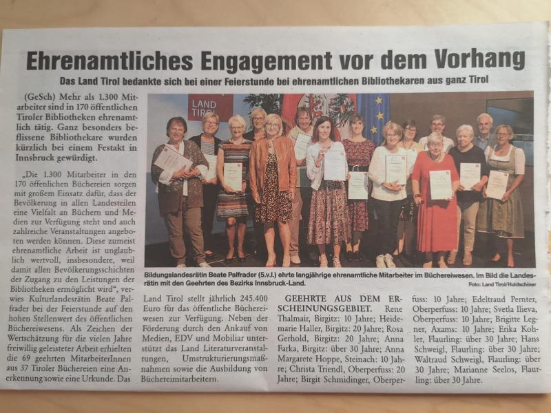 Anfang Mai lud die Tiroler Landesrätin für Bildung und Kultur Beate Palfrader zu einem Festakt ins Landhaus ein, um Tiroler Bibliothekarinnen und Bibliothekare für viele Jahre ehrenamtlichen Engagements zum Wohle der Gesellschaft zu würdigen. Frau Palfrader betonte, wie unendlich wichtig die Arbeit in den öffentlichen Bibliotheken ist vor allem hinsichtlich Kommunikation und Leseförderung in allen Altersbereichen ist. In diesem Jahr war es Susanne Schwelberger, die nach 20 (zwanzig!) Jahren ehrenamtlicher Tätigkeit in der Bücherei Oberperfuss an dieser Feierstunde teilnehmen konnte. Auch wir sind sehr dankbar für die vielen Stunden, die Susanne der Bücherei und den Leserinnen und Lesern bisher gewidmet hat und hoffen, dass diese Tätigkeit ihr auch weiterhin Freude machen wird.